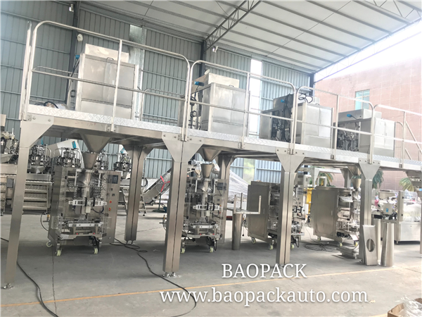 The automatic packaging machine can pack the bag into the consistent specifications according to the required shape, size and the requirements of the packaged items, but manual packaging cannot be guaranteed. However, when you want to pack multiple materials but want to save costs, you can consider multiple packaging machines with multiple scales. The scale has different liters, and you can choose different liters’ weigher to package products with different grams. as the picture shows: